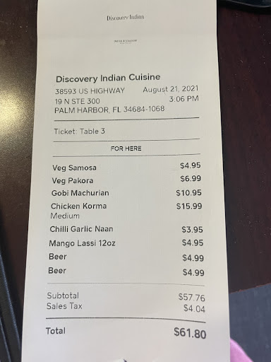 The third time we went, it was a Sunday afternoon, and we took our son. A harsh critic. He ordered the Lamb Chettinad Indian hot. And a mango lassi. He ate it all and said it was fantastic. I tried his Lassi, and it was a thick blended delectable drink. You could definitely taste the mango. In addition to the Peshwari Naan, we ordered garlic Naan. It was awesome. My husband and I had the chicken korma again. It's that good. So far, I highly recommend the Discovery Indian cuisine restaurant. We have gone on a Saturday night, tried takeout on a weekday, and gone on a Sunday afternoon. It was delicious and consistent every time. We definitely recommend you...