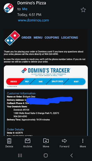 Read moreOn 24 APR'21, I placed a $50 order with store #5104 (Wells Road)@8:02pm, Order #470570, for delivery. The estimated order ready time was 8:31pm. The store location is 3.5 miles from our address. At 9:30pm, after numerous unsuccessful attempts to reach the store by phone, I was in the car, hungry, leaving our Home, to drive to store #5104, when I encountered the delivery driver pulling into our townhomes... he gave me the name of his manager. The next afternoon, when I contacted, "KYLIE", to make her aware of the unsatisfactory experience, I was stunned by her lack of ownership of the situation and the overall absence of customer service skills from someone claiming to be a "manager". At no time, did she even offer a simple apology for the hour and a half delivery time, instead justifying it by stating, very matter of fact, " ...it was Saturday, we were busy". Because of the lack of leadership, accountability, enthusiasm, and absence of customer service we received from Dominoes #5104, the next time I am ready to spend $50 of my hard earned money on pizza, I will absolutely take my...