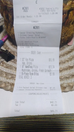 This is now the 2nd time with issues with our order. This order beats them all...as you can see by receipt the pan was supposed to have onions, green peppers, sausage and we'll done. The pizza had no sausage and was almost raw in center. As well as 2 inches all the way around with no toppings at all. The second pizza was stuck to the top of the box, after scraping the toppings off the pizza was of course cold. When calling the store was advised they ran out of sausage yesterday and just made the pizza without it. HELLO at least a call to advise would've just chosen something else. The original person who answered the phone was nice and empathetic...but the manager was as if we were bothering him. No apology, no nothing!! We were offered new pizzas or credit for the pizzas...we took the credit. When this location first opened they were great...that lasted maybe 2 months tops. After that it's been horrible. I do NOT recommend this location at all. And honestly I would rather order from papa john's at this point than reorder from this store. Think about your options before...