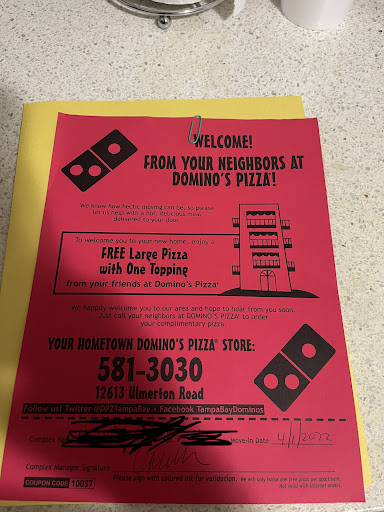 Read moreFirst disappointment was my lack of greeting when I came in the door to pick up my order. Second disappointment was the totally disengaged and nonchalant manner of the employee who gave me my order. I asked for paper plates, I received three (for two large pizzas), and she tossed them on top of the boxes with no acknowledgement whatsoever. I asked that the plates be put in a bag, I get a sigh instead of a "happy to help you, anything else I can get you". I was never even thanked for my patronage. Final disappointment was the food itself. Dominoes was extremely stingy with the toppings on both my pizzas and they were so bland we might as well have been munching on cardboard. Bad service, bad food. I've had frozen pizza that looked better. Gosh, I wish Donatoes was in Florida! They are the real Champs of edge to edge toppings. Never ordering from this joint again. BTW, for those who are health conscious : absolutely no one in this place wears gloves while handling the food. These pizzas went into...
