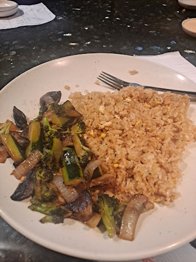 The fried rice contained neither eggs nor vegetables. And you know when rice sits out for a while and gets crunchy? That's how ours was. As though it wasn't freshly cooked but just sitting out. The vegetables consistently of zucchini, mushrooms, and onions. These too tasted as though they were not freshly prepared. As though they had been cooked prior and then remained on the stove top, and thus became overcooked. The zucchini soggy and the medley overall lacking flavor.
