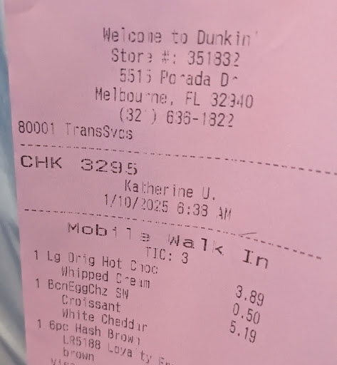 Read moreI never ever leave bad reviews because I know how bad it can harm a company however, the experience the customer has inside an establishment is #1 and who you hire represents your company. I went into this dunkin (usually a drive thru person) because my daughter wanted donuts. Honestly, I go to Starbucks and will never return to this dunkin ever. Service was as if I was bothering her or messing up her day because I wanted to order something. I asked for something unusual apparently because I was instantly told I couldn’t have it. When I know they are a place that sells stuff so it can be done the person was just too lazy and had too much attitude to even think about how she could do it for me. After I was instantly told nope can’t do it I cannot sell you munchkins in a cup I asked why this was so hard to understand? All the Dunkin’s I have been to in the past have little cups of munchkins ready to go in the mornings and they are quick little treats to grab and perfect for quick sales too! Not sure why this dunkin refuses but I got sold the cup for .50 and then the 10 munchkins to which she refused to put them in a cup she put them in a bag and then handed it to me. So I had to put it all in the cup with the lid. Look I don’t mind paying the .50. That’s not what bothered me it was the fact that I asked for a simple adjustment to a normal order. It’s not that hard and if she was just a little bit more kind and had a touch more humility she would’ve seen it wasn’t that hard or much of a request. NEVER going to this viera dunkin again....
