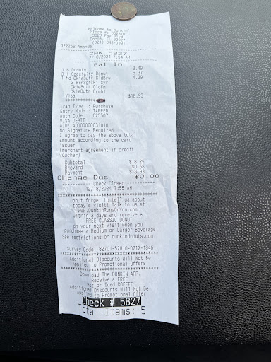Read moreWhen you go into this place make sure you ask and check your total in your receipt because they will over charge you and they wonât do anything about it if you donât pay attention and if you do pay attention and bring it up to them on the why you being charged that amount they will give you an attitude about it like how dare you !!! We went in and got a ckiebutr cold brew for my wife and some donuts for the kids. So she orders half a dozen donuts and 1 cookie crumble 2 glazed and 3 grinch one that they have for the holidays welll she doesnât tell us that those arenât included on the half dozen. And she put them in a box gives us the total and charge us for half dozen $8.49 and another charge for 3 specialty (which she messed up the icing ) for another charge of $5.37 she gives us 3 regular donuts charges us for half dozen and then 3 specialty donuts for extra 5.37 she over charge us about 4$ dollars more than she should have and only give us half of the donuts she charged us for and she got an attitude about it when my wife ask why was that extra charge if we didnât even get that she say I can give you the other 3 donuts to make that half dozen (that she had already charged us for ) and she literally threw 3 donuts in a bag and put it in the counter with out saying a word like we magically supposed to know is for us . and the âcold brew drink â đđ it sucked it looked like they scrambled it up and put it in a cup with hate not even tried to make it look Ook or somewhat good tasted terrible over all it was a waste of $18.93 that is shouldâve gone and spend it else where instead of this so called âDunkinââ soo remember people next time you go to the Dunkin donut in port St. John cocoa fl 32927 make sure you check your charges before you leave and always ask for your recipes to see what you being charged for. Amanda is her name by the way sheâs terrible with customers and a bad attitude problem (see for...