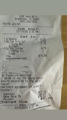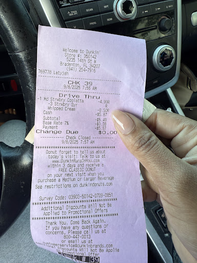 Read moreI live close by to this Dunkin. The young african American guy that works in the afternoon around 2pm NEVER honors the promos that they place on the doors. For my last 3 visits when he works he has charged me full price. The main reason why I come at 2pm is to catch the $2 iced coffee after 2pm. I've been charged full price which is bad advertising. Today I told him I wanted the promos at the front door and he said ok. When I look at my receipt he charged full price. When the young Hispanic guy works he honors the discount. I guess it's a hit or miss that I need to go when they want to do their jobs. Also the young lady that works in the afternoon has honored the discount. The frozen coffee I ordered as you can see below in the picture is all milk there is no coffee in it whatsoever. I hope Dunkin is still not going by America runs on Dunkin cause they have just gone downhill. Where I'm from in NY/NJ they really take pride in their services and quality of food. Down in Florida customer service sucks and it shows in the quality of food.