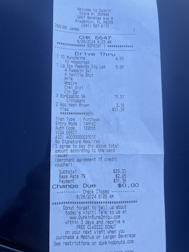 I honestly shouldn’t be surprised that nothing at the store has changed. I placed a mobile order this morning in the hopes that ordering ahead would help simplify the process. I waited in the drive thru line for over 20 minutes. There were 4 cars in front of me. Sure, I could have walked inside, but the purpose of having a drive thru is to speed up the ordering and pick up process. When I made it to the intercom the abrupt, clearly frustrated employee, proceeded to tell me that she “didn’t have half of the donuts that I want.” I thought well, that was a nice greeting. Then, she quickly verbalized the list of donuts that the store did have. I proceeded to tell her the donuts to replace. As the conversation continued, I pieced together that the store didn’t have ANY of the donuts that I originally ordered besides glazed. At this point, I contemplated just canceling the order but had already committed to reordering and paid ahead of time since it was a mobile order. I asked again, what donuts she had available. Again, in an abrupt and frustrated voice she listed the 5 donuts that were available. I finished the order and drove to the window. When I arrived at the window she just started shoving my order at me. There was no apology and there was no offer of a refund, which I am 100% sure would be a task that is completely unattainable for this staff. As for the other items I ordered, the bacon was cold and I’m positive the coffee was plain with sugar. Not the white chocolate speciality drink that I ordered. I can’t help but wonder if the attitude from the staff is due to them being paid below Floridas minimum wage which is currently $13.00/hr. $12.00/hour for employees and management is being paid almost unlivable wages at $48,000 a year. At least, that’s according to the sign that’s hanging outside of the wooden fence concealing the dumpster. I suppose the saying “you get what you pay for” applies in this scenario. Rude, stressed, frustrated employees and incompetent management. This location is truly damaging the Dunkin name. Please refer to all of the 1 star yelp reviews. As a corporation, a LARGE corporation, employees and management should be compensated appropriately. This location might actually be able to retain employees that care about the business if they could at least afford the cost of living. I’m going to assume this is the reason for the Bradenton, Florida (Manatee Ave) location being in shambles, years on end. If someone in the corporate office slightly cares, assess the wages, compensate the employees appropriately and send resources to help this team become successful. Although, I’m sure corporate is more then satisfied collecting their paychecks on overpriced donuts and coffee while the employees and customers suffer. It’s truly a shame.