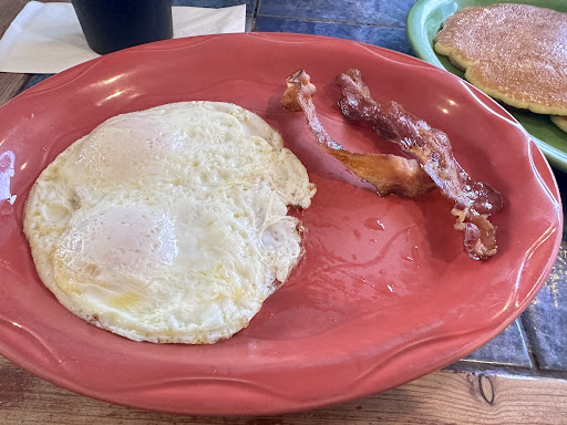 The griddle cakes were akin to the powder puff bakery item of the Three Stooges; the bacon was of the lowest possible grade to still be considered fit for human consumption, and I did manage to get it down. My over-medium eggs were so poorly cooked that it begs the question if I got a trainee line cook (I did not).