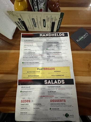 Read moreI’ve been eating here with my wife and son for two years. The food is EXCEPTIONAL it doesn’t make a difference what you order. Wings, Sandwiches, Philly Cheese Steak, Burgers/Chicken on a bun, Texas toast, wrap it’s all good! Salads, sandwiches, and their fries are some of the best I’ve had. The appetizers Rock! They have a LARGE Pretzel really thick that circles the pan with 3 chicken tenders, mozzarella sticks, and beer cheese dip along with NUMEROUS other dipping sauces that KICK UP the flavor all the more. I HIGHLY Recommend Flanagains to anyone who wants GREAT FOOD at a very reasonable price, TVs all through the place with seated dining on one side and the bar high tops on the other with pool and darts. I love to grill and it’s hard to go out and spend money on food you can make much better yourself for a whole lot less. I’ve never been disappointed with a meal...