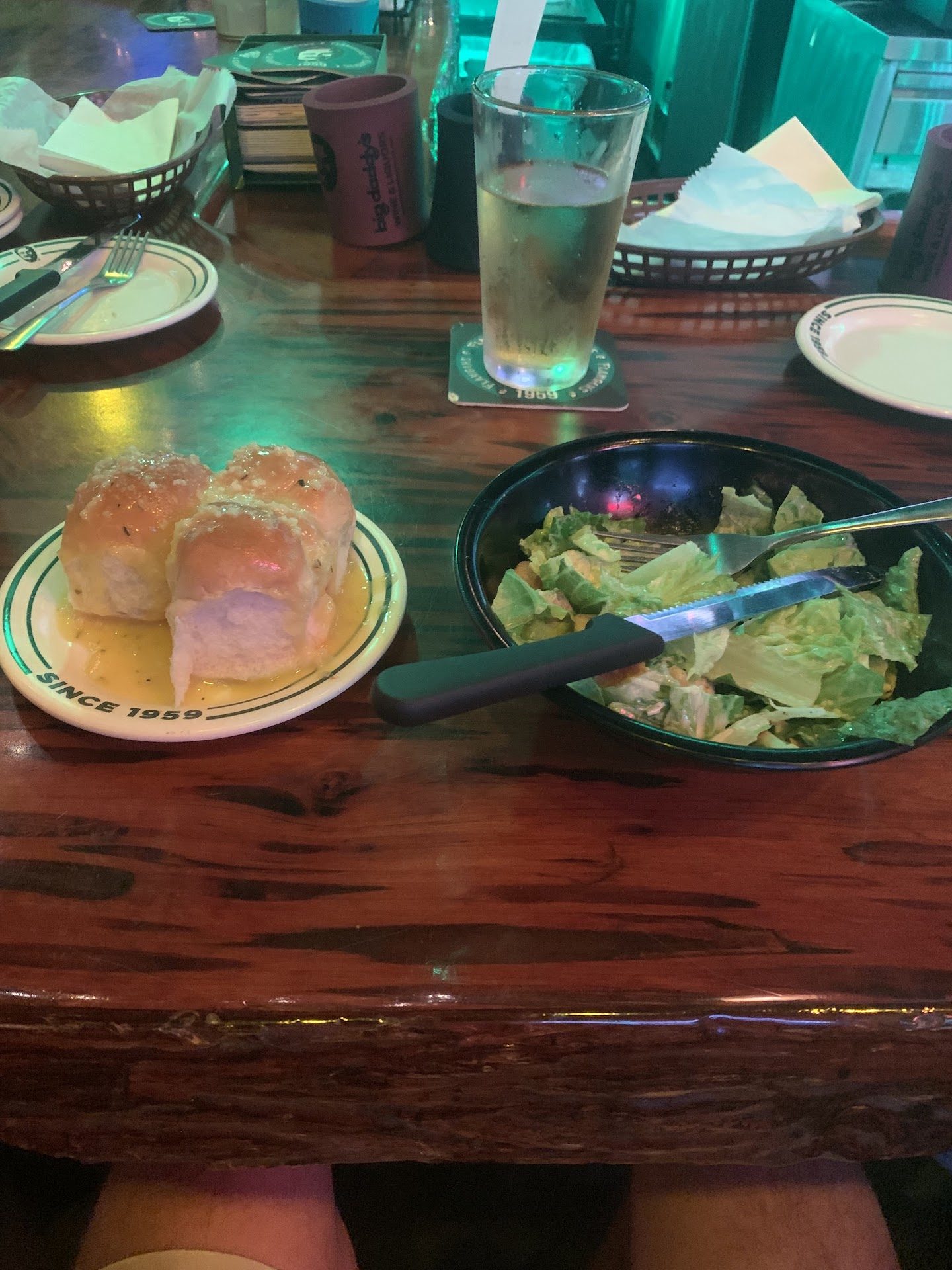 When I returned from bathroom my buddy told me she had said I need to order a soda in order to qualify for the special. She didn’t say that while I ordered, I realize now it was because she didn’t have time. She didn’t have time to bring me a beverage at this time so she just got back whenever she could, which was when I went to the bathroom. So here I am again doing the extended neck dance hoping to catch her eye so that my beverage can arrive prior to my meal. (I didn’t know at the time our meals would take 25 min)