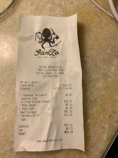 Read moreI don't usually do any food review as I think it is mostly wasting my time. But this time I have to say something. Overall the service is nice, the waiter is a very nice guy. BUT, the food is terrible! Terrible! I was with my dog, below are the food I ordered Miso soup- SALTY! Very SALTY! the seaweed was not well prepared, it is still little dry, and hard to chew! Teriyaki Chicken and Rice: It is hard to tell how they cooked the chicken breast, doesn't look like fresh cooked, definitely not grilled, Teriyaki sauce was aside, just a plain brown salty and sweet sauce. And the rice, for an Asian restaurant, I never be able to imagine the rice can be cooked so poorly. Definitely put too much water , doesn't look and smell like fresh cooked. Might re-heated from left over. Chow Fun with Beef : it is always my favor dish at any other Asian restaurant , but very disappointed at Ganzo, it is definitely not sauteed but rather just mixed with brown sauce with no other flavor but salt ! Every thing is just dark brown, beef is not fresh cooked, just warm, looks like boiled, noodles are all stick together, middle layers of the noodle are still white color and COLD! Rainbow sushi: Since all these dishes are terrible, but I am still really hungry, since I have no food at home, I ordered rainbow sushi to go. I think it is the only dish not too salty, eatable, but the rice they use is not sushi rice, very soft, no taste, and fishes are not good either. It is very disappointed meal, I don't know how they are going to survive if they don't serious consider improve their food. Will never recommend any friends to go there even though it is so close to where I live. I truly wish they can serve good food, since it is so convenient for me. Unfortunately it is the most...