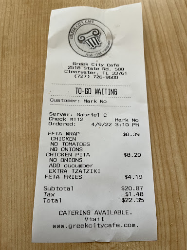 Read moreWe have had great food every time we have visited (more than 10 times during the past year). Service hasn't always been spectacular but when it's good, it's really good so that makes up for it. I always get the greek salad. I like how it's all chopped small. I love their design and logo/menus, very creative. I had to ask who does their design and they said KAZE MEDIA does it, I'm going to look into them for my next website & business card revamp. We also love the feta fries. I crave them. Would love a skinnier fry option, they use the med size steak fries but they are still delicious and crispy, not like some steak fries that are soggy. We love the desserts too, I think the desserts might come from Hellas and Hellas is another favorite of ours. They have seating inside (during busy times, there never seems to be enough seating so get there before the lunch rush) and they have outside seating. This is Florida, I don't think I've ever sat outside to eat a meal either because it was too hot, too muggy, too windy or mosquito-y. But the option is there, I guess that might be a good option for smokers, not sure. Five stars. Love it here. Once a...