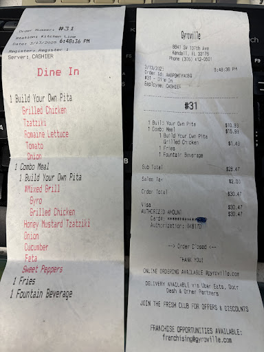 First, we believe in rating places when they do extremely well and have reviewed many restaurants in that manner. This is not the case with Gyroville in Kendall. I ordered a traditional pita and, when I received the order, the Ziki sauce was fermented and rancid. We were told that they could not make something new and could only replace with the same item, minus the sauce. We were informed that we could NOT pay the difference to order something else and they would NOT refund the money for the uneaten item. Getting the managed Angelina on the phone was an equally frustrating experience - she does not support her employees who kindly tried to resolve with us only to be told by her that they cannot resolve this. What self respecting restaurant and manager treats their customers like this? Very bad business, lack of common sense and business acumen on Angelina/managers part. You will lose many customers with your practices and we feel very sorry for your employees who want to do the right thing but are hindered by your poor customer service. We are very close with the health inspectors in Dade County and you should expect to have this reported accordingly. Shame on the manager who does not know how to manage her business, her employees, and most of all, her customers.