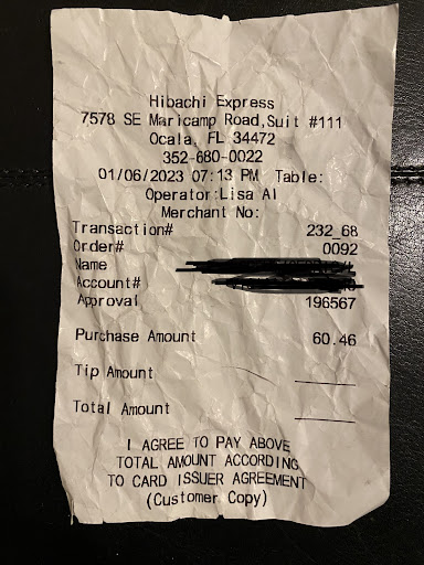 At around 9pm, I went back to Hibachi Express in order to explain my displeasure. The female worker behind the counter was adamant that they did not use sesame seed oil and I was handed $10 (in cash) on a $60 order for my troubles.