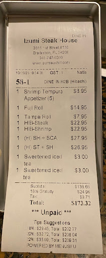 Went here for our daughter’s birthday. We had a good time with family. This was our first time here.They will not start serving you until everyone is there and seated. The food is ok. The sushi is not great, it’s about what you get from a grocery store. Very dry. The hibachi chef was entertaining to watch, but if you have been to a hibachi grill before, you know what to expect. For a first timer it’s entertaining. He cooked the shrimp perfectly, however, he cut the scallops in half and overcooked them my husband said. You of course sit with other people to fill up the entire space. Which is very cramped. (No bubble space). Let alone a way to get in and out unless you go straight in and straight back. The service was was alright, but not wow, especially since it was our daughter’s birthday. But you could apparently “ purchase “ their cake. No thanks, not exactly their specialty. PLENTY of rice for everyone. My daughter enjoyed herself is what counts. We are accustomed to better food. This place is actually very expensive. Compared to a lot of other places. You usually pay the waitress however, ours was busy. With the other side of the hibachi so we paid at the register. CHECK YOUR RECEIPT , we had a group of 7. GRATUITY WAS ALREADY INCLUDED. Most restaurants start adding their own gratuity at 8. But they are all different. We will probably not return on our own, unless a family member chooses to come back for an occasion. This was a one and done for us. We can get much better food elsewhere for a much...