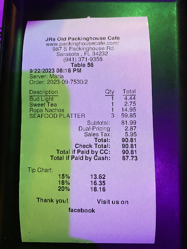 Read moreOk to start with, I had no plans on writing a review. Im a normal dude not a blogger , that was looking for lunch. I checked the price before going to the restaurant for a Cuban sandwich - website for JR's states 7.95. I go in sit alone at bar and order the food. Retired Bar tender asks if I was chips or fries with it, I tell him fries. Food comes, Its good; even might say excellent tasting. The Cuban was authentic and the fries were so good I didn't need ketchup. Here's the rub; Wait for the receipt- no bartender for about 7 mins; its ok though enjoying the atmosphere. He comes by hand him my CC to pay, He prints off a receipt that has half of it printing, no price of tab. I tell him that it has no price on it, He states its right there although on further inspection cannot locate it. Bartender guy calls another guy to look at machine, cannot figure it out. I tell both of them, the printer is only printing half of receipt. After 5 mins of troubleshooting they decide to print on a different printer, mysteriously it works although it states 12.62 roughly and I'm told they cant give me a copy. I ask about the jump in price and guy states I have a drink and fries; I point out I have water. He states because of the fries its extra and the Cuban is 10 something. I didnt ask for fries on ordering, he asked me whether I wanted chips or fries with sandwich, I assumed( ASS_U _ME) this was inclusive but kept that to myself. I say OK ; kinda roll my eyes a bit and pay the bill, and regret leaving a cash tip. Real question is, Will I return. I liked the food, the small homey atmosphere. Customer service has flown out the window and down the road. I like the location being less than a mile from my house, Id consider it but will keep a tight eye on the bill next time. Also If I return, I would sit at a table and...