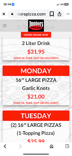 Read moreI have ordered from Juniors many times since I have moved to my house in May. They were conveniently located literally just down the street from my house. The food was good and never really had any issues until tonight. I work from home and today just happened to be a 16 hour day. Adding to it my son was sick so I wasnt able to leave the house. I ordered online a medium pizza and 10 wings for delivery. Ten minutes after I placed my order I was contacted and told that they were out of wings. They asked if I still wanted the pizza. I said yes and was told it would take an additional 20-30 minutes. After over 30 minutes I called and asked when the pizza would arrive. I was told that it was set for pick up. I said no I specifically asked for delivery . I live less than 3 minutes drive down the street, but I am working and my kid is sick. I needed the delivery. The guy on the other end of the phone was so quick to argue that it said pick up on the order that he was looking at. I said that maybe when they cancelled the wings part of my order since they ran out , they may have put it for pick up but I really needed delivery. At no time was there any offer to change it to delivery. I had already added in a tip in the order to cover for it. The guy just continued to argue it was for pick up. He said he didnt even have my address. I told him that wasnt true because not only do I have a login for their website since I have ordered from them quite a few times before, I also had to add my address for the new credit card that I provided to pay for it. SO I told him to cancel my order and refund my card. Clearly customer service is NOT at the top of their priorities. It is sad because I did like their food. I am hoping that they refund my card so that I do not have to dispute the charge. Such a sad experience for what I hoped was a great family owned business. All I wanted was for the pizza to...