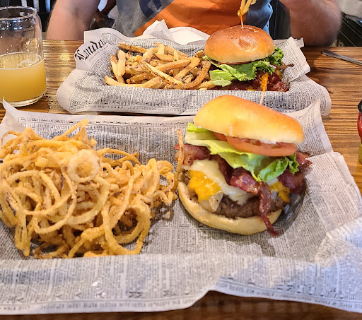 I'm giving 5 stars for food, service, and atmosphere. Service was great. Multiple people checked in on us, making sure we were happy. Our server was friendly. The food runners were quickly moving hot food to the tables...almost running to get the food out. For atmosphere, it has a very open and spacious feel, tables far enough apart for privacy, with a very homey decor of dark refurbished wood panels and shabby-chic light distressed pillars and accent wood. It was our first time there, so we didn't know if it was newly renovated, but it felt new. What was most notable was the cleanliness. We saw how clean the floors, tables, and condiment bottles were. That seems to be a rare thing in restaurants we go to. So it really stood out. The large bar area was very organized as well, and clean. That gave us confidence that the kitchen is likely kept clean. The restaurant is well lit, not gloomy, even though there is dark wood walls. The food: my hubby is very picky about burgers, but decided to try one. It was so good that he had to tell the waiter, who informed us that they recently won an award for their burgers!! It is that good! He had requested jalapeños, so that gave an extra wow-factor. We had the baked brie for a starter, which was awesome. It comes with hot, freshly baked pull-apart bread, crispy exterior, soft inside, plus a perfect jam that tasted like apricot, and a savory tomato based jam. The brie came baked in a little black iron pan from the oven. It was everything you could hope for. I like to add a bit of salt on the brie, since brie is not very salty. It really brought out the flavor, and with the jam, you get the salty-sweet. I had a fish dish of two fish, shrimp, and muscles that were cooked in a creamy coconut sauce, with rice. Delicious! Dont expect it poured onto a bed of dry rice. The rice was mixed into the sauce, so it was like a thick seafood chowder on a plate, with hot fresh bread to soak it up. My hubby even dipped his fries in it when I couldn't finish it all. There is plenty of seafood in the dish to satisfy. A nice big portioned dish. We will definitely go back. We were too full to try the desserts, but intend to go back, just to try them, without having dinner first. Bathroom...