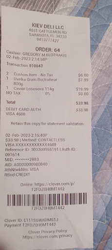 Read moreVery disappointed with Cashier Gregory M Klothakis. Today February 2,2022 .This is how you guys run your business? Charge your customer exstra $ 6.00 DOLLARS TO GET 1 STAR REVIEW. Well,I'm very disappointed with cashier Gregory M Klothakis .I bought today 1 Uvelka Grain Buckwheat-$7.99 + 1 Caviar Lososova -114 g - $19.99.i don't know why he charged me extra 6.00 dollars for custom item -no tax .what is going on??? This is how you do your business?Gregory M Klothakis steel customers money. Also I'm noticed there responding only for positive reviews. What goes around comes around. Keep this in...