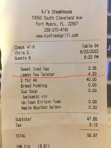Read moreOur 12th Anniversary, celebrated on our actual 3rd leap year anniversary, took an unexpected turn leading us to KJ's Steakhouse, a decision that transformed our evening from disappointing to unforgettable. Having left another high-end establishment in Fort Myers due to a reservation mishap and lack of acknowledgment for our special day, we arrived at KJ's without expectations or a reservation, merely hoping for a quiet dinner to salvage the night.