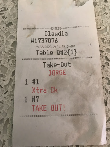 9/22/2020– As you pull in the parking lot on the north side they have orange cones along the building for your pick up. We ordered a head of time and number one and number seven for lunch the girl came out gave us a credit card thing and gave us the food and off we went food is always consistent no chips were to go but that’s OK cause it’s plenty of food Number one was the quesadilla I ordered chicken with it no problem. Number seven what is the baby Palomilla which came with of course white rice black beans and plantains a packet and start a phone not crazy about that but the food was great the service was g