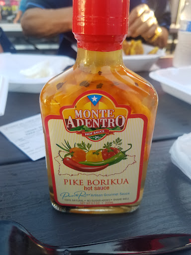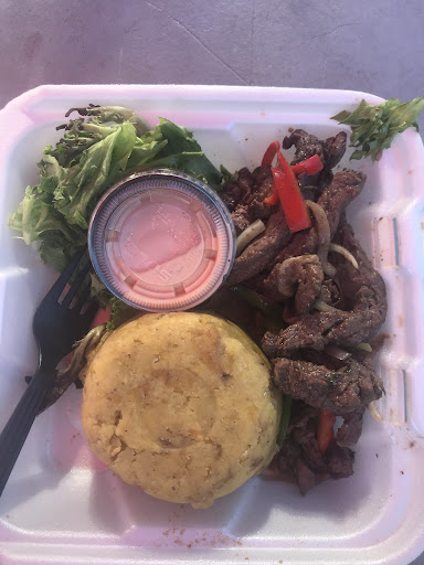 Busy food truck with adjacent picnic tables serving mofongo & other Puerto Rican eats, plus frappes.