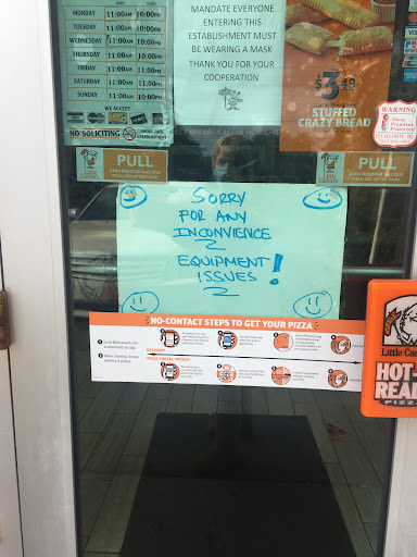 This Location is a joke I came in on Tuesday (day of this review was left) at 5:40,after calling for over a half an hour so that I could tell them what kind of pizza I wanted to order but they never answered the phone I had called many times and the entire ride there and they NEVER ANSWERED! when I got to the parking lot I saw the door had a sign that made it look like it was closed, even though the open light was on. I sat there for another 10 min trying to look up the number for another pizza place on my way to company gathering .I actually decided to just go for the door after two people left after not trying to open it. It was open , I go inside and told the worker how I had been trying for a long time before getting there so I could order many different pizza for the company party but they were not answering n the lady working the counter lied right to my face and said that they have been slammed and I “just missed it” and that’s the reason that they hadn’t been answering the phone there, even though I had been in the parking lot for over 10 minutes and I told her I had been she said oh there’s just a few of us and made so many excuses now on top of the lie I called her out on. She didn’t apologize just got the plan pizzas I had to settle for with an attitude like I inconvenienced her even coming inside and not run off by the sign the made for door I saw make several people not even try the door and leave very mad , then she didn’t give me the sauce for my breadsticks N I had to turn back around after I realized she didn’t put any sauce in the bag. when I was coming back in I redialed the phone while coming back through the door and I couldn’t even hear it ring they had turn the ringer off and this sign on the door. Who ever was running this store should be fired! Between the sign on the door making it look closed or NOT SAY what the issue is, then lying about what’s going on, turning of ringer, being rude to the customers n due to their bad service only having plan cheese pizza n nothing else it’s only a matter of time before it goes out! With COVID and everything going on u would think these workers would be grateful to still have a job and count there blessings but they clearly don’t want to be bothered !! I have included a pic of the door note that makes NO...