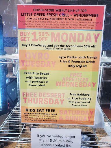 Read moreIâve always been an avid Little Greek fan, been to the one in Celebration and Winter Garden many times, as I have been to this location a handful of times but I just left from a horrible experience! I called to place an order and was told to be on hold by a gentleman Evan for 1 minute... that turned to 13 minutes that I was able to drive and get to the location while still being on hold. I asked to speak to the manager and I guess there was a Lead in this evening, Paul. And honestly he is very sweet. I showed him my phone call time etc and explained he then went and got the guy and Evan stated well, wouldnât it have been logical to hang up and call again... I almost lost my mind considering when I walked in he was talking to a girl who may have been a customer but then once she left he was free. The logical thing Evan would be to do your job the right way instead of the customer chasing you down. I appreciate Paul and his desire to fix the situation and the other employees there tonight were very amicable but Evan is a horrible employee.. plus I saw him clean the counter tops with a spray with the same gloves he was packaging food with... not so logical there Evan.