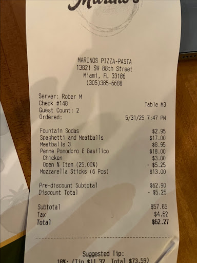 Read moreIf you’re looking for amazing food, next-level service, and a cozy, welcoming vibe, look no further than Marino’s Pizza in Kendall. This place is an absolute must for anyone who loves great pizza and genuinely good people.