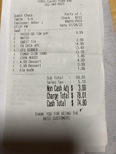 Read moreMy wife and I ate here for the first time after years of telling ourselves we wanted to try it. They weren't very busy for a Sunday morning around 10:45. We waited a couple minutes to be sat when there was no wait and open tables everywhere. Once we had our table it took a few more minutes for our server to arrive at our table and she asked if we were ready to order, we were since we had plenty of time to review the menu. So we ordered our food and drinks and waited. Coffees and waters came out relatively quickly. It was another 10 minutes before our food came out. My wife ordered the Mary's chicken biscuit with no gravy and I ordered the biscuits and gravy breakfast. My meal was good, standard for a diner like this. My wife's meal came without the gravy, as requested, but had cheese on it which she claims the menu stated was an upcharge and she didn't ask for it nor was it presented as an option. It took the waitress nearly 15 minutes to return to our table so we could let her know and send it back. After a couple minutes she gets the plate back and the chicken biscuit looked great. My wife had a weird feeling so she flipped the chicken patty over to discover that the cheese wasn't removed, not completely anyways, and the chicken was cooked again. So the cooks just flipped the chicken over to try to trick us into thinking it was corrected. It took another 10-15 minutes for the server to check on us again and my wife told the server it needed to be removed from the check. I had finished my meal by now and she was disgusted with how we were being served. Mary came by and apologized profusely and offered a dessert for our troubles, which we declined, and reassured us that she had removed the meal from our check. We weren't the only table to get not so great service as a table of two sat near us and they went an entire 30 minute meal with no refills and didn't receive their check, one of them ended up walking up to the counter to pay. We had high hopes to find another great restaurant in our area but I don't believe we will be able to revisit, there are too many other great breakfast diners...