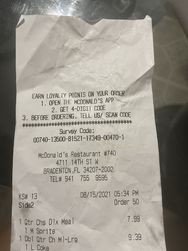 Read moreOnce in a while, I crave a McDonald's double cheeseburger. I pulled into the drive-thru located on 14th Street West . After a 45-minute wait, I got my paper bag. So, I pulled over, mouth watering and to my surprise the bag contained a regular cheeseburger. Upset, I pulled around, parked and went to the counter. No one was tending the counter. After being ignored for about 15 minutes, I spoke up. Finally I got the attention of an employee. I was able to find my receipt in the top of my purse!