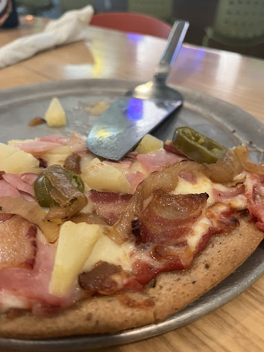 Food: I'm from jersey..so if you're from the north east looking for some jersey/ny style pizza go somewhere else. But give this place an honest try if you're open minded. The dough is almost pretzel like fluffy, the toppings are super fresh and you can build your own if you want to. Good non Jersey style pizza. Worth the try....