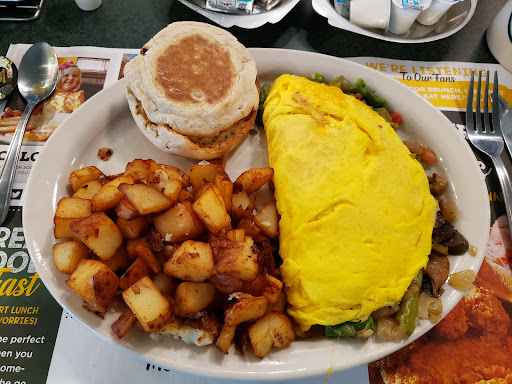 Seated inside. A couple that walked in behind us are seated next to us in a booth for 8 are immediately greeted and coffee poured. 10 min until our server shows. We order our drinks & the same entrees just to avoid any more delay. She's (no name given) either new, in the weeds, or just no sense of urgency. If it wasn't for the lovely, fun & on-it, pink bandana lady, Sandy, who was helping the table next to us, we'd never get refills.