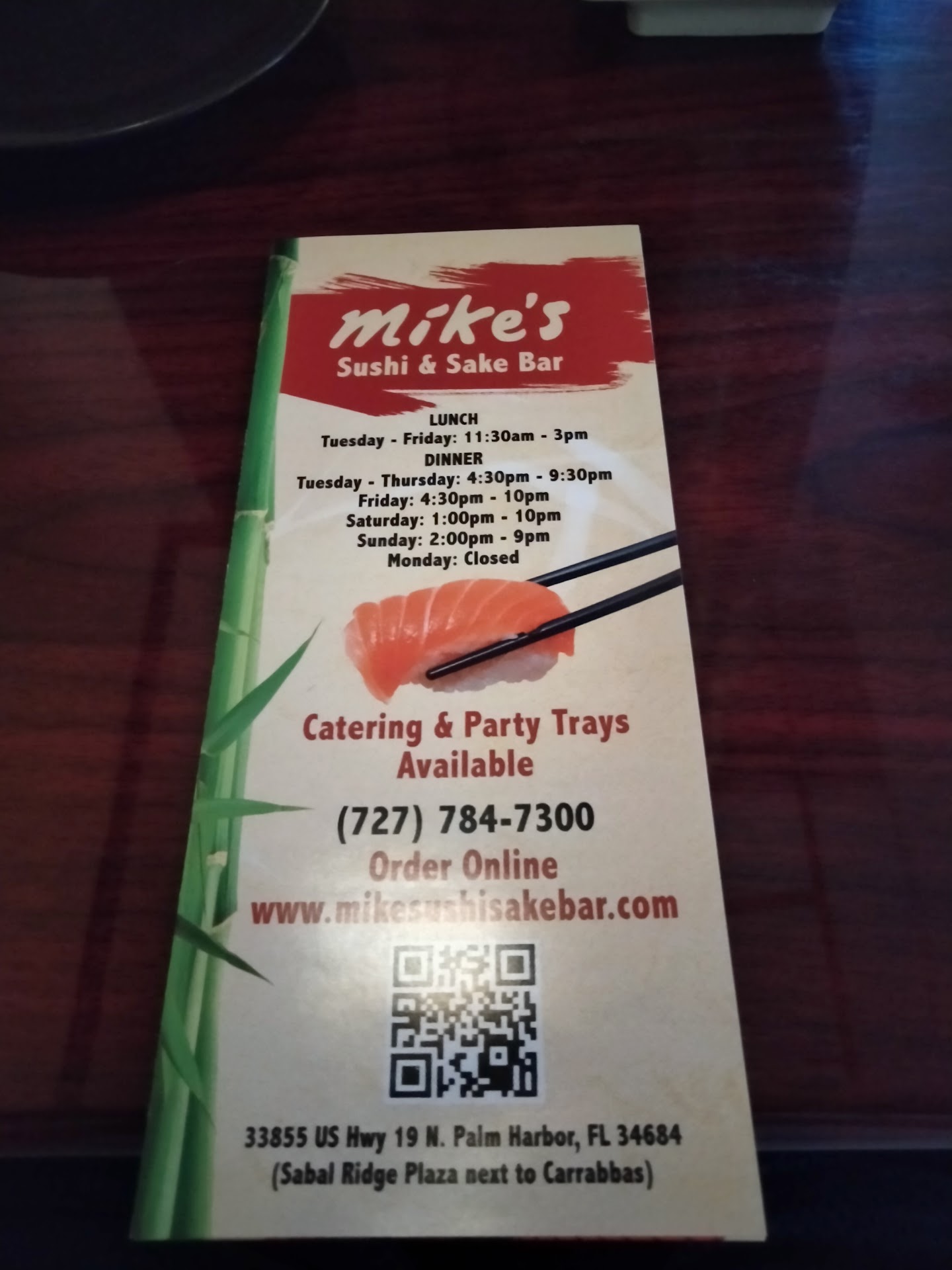 Read moreI have been searching for an awesome sushi restaurant for the past 3 months. From West Tampa to Holiday to St Pete and several sushi restaurants in between. I would find a new place and spend the next three days trying different rolls. Maybe I was just lucky but every place I went to was good. There wasn't one that stood out over the others or one that was bad enough to single it out. I just happened to be in Palm Harbor last night and saw a sushi bar in a strip center. I ordered two rolls online, to go. Traffic was horrible so I decided to pull back into the parking lot and eat my sushi. IT TOOK ME OVER 90 DAYS AND PROBABLY OVER 100 ROLLS TO FIND A SUSHI BAR THAT EASILY STOOD OUT OVER THE OTHERS. MIKE'S SUSHI IS HANDS DOWN THE BEST SUSHI I'VE EATEN IN FLORIDA. The flavors were on point, fresh and absolutely delicious. The presentation was pure artwork. The price for the signature rolls is just a little higher than the average sushi bar but I was pleasantly surprised to see that the portion served is close to twice the size of all the other competitors. If you like sushi then Mike's Sushi Bar is the place to go. It is a definite 5 star sushi bar and you won't be disappointed. I'm looking forward to going back...