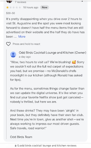 Just wanted to update my review. We went to Odd Birds again last night for a couple of drinks. They updated their speakeasy experience. You need to make reservations to get inâŚand getting in is so much fun! The hostess takes you to a secret door. Once inside, it is bartenderâs call. Our bartender (I believe his name is Chris) came over and sat with us to ask us a series of questions. He came back with the most amazing cocktails for our party of 4. When you factor in ambiance, service and taste, I currently believe Oddbirds is the best bar in St Aug. this is saying a lot as there are multiple great places in St Aug. cheers to...