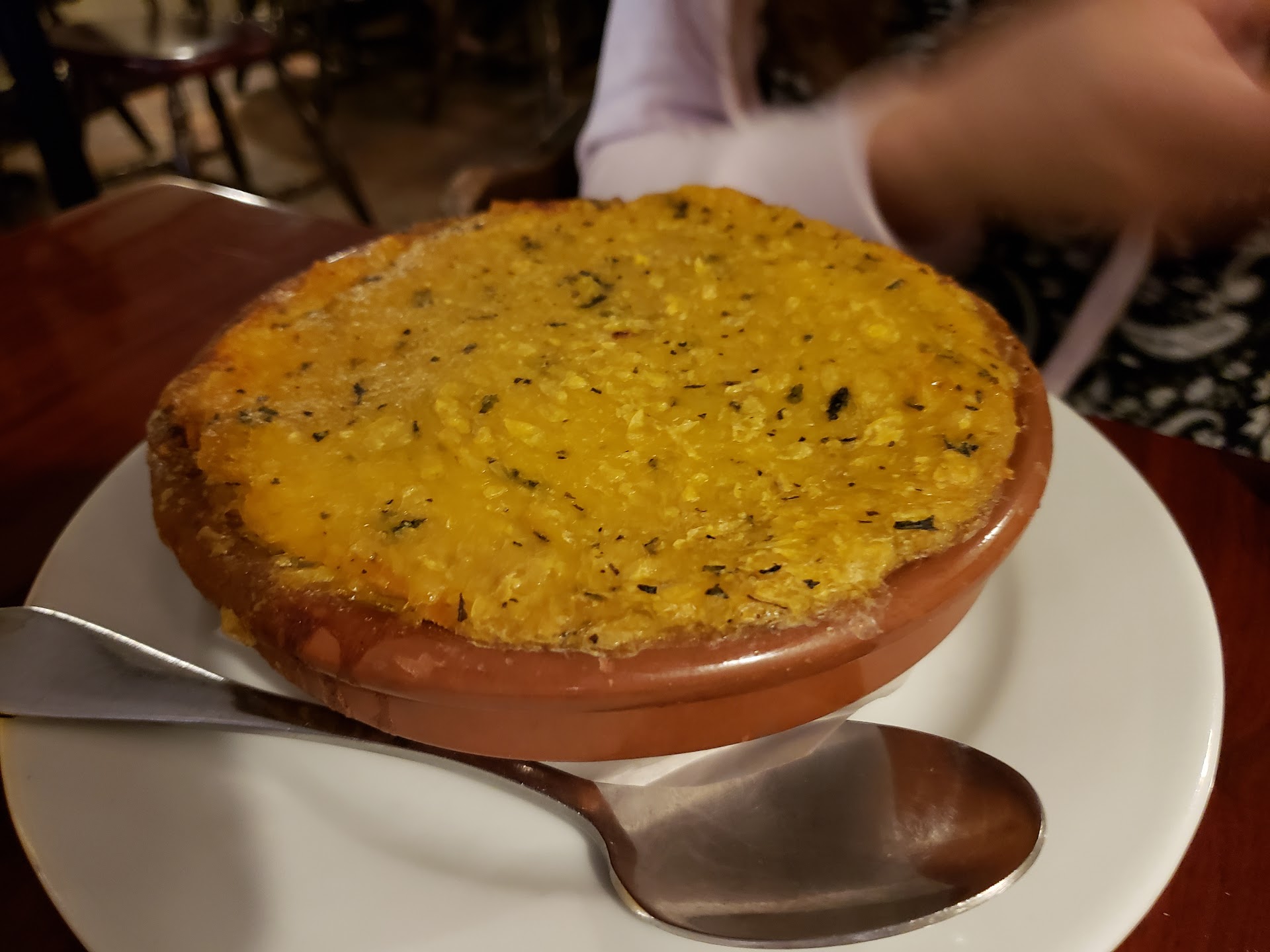 I finally was seated, handed a menu and some bread with salsa to munch on without ordering my drink. I didn't mind at the time though since I was so hungry and happily ate the Chilean bread----the salsa was delicious and had a nice bite to it. It became a problem when I waited 25 minutes at my table looking to put in my drink and lunch order. Finally, someone noticed me after trying to wave down multiple staff. I ordered the shrimp empanada (which I noticed everyone in the restaurant ordering these gigantic empanadas), the mariscos de crema (their menu is very seafood based), and the lomito (pork) sandwich.