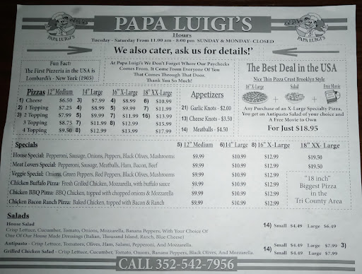 If I could rate Papa Luigi's any higher I would. I'll start from the beginning of my first time there. I walk in and the first thing I notice is how professional and well put of an establishment this is. Then the pizzaiolo (guy who makes the pizzas) is very kind and seems ecstatic to be working, and even though I was not there to pick up the three pizzas he first yelled at me for (also very kindly) I could tell he was very good with people and really seemed to enjoy his job. I proceed to place my order and the cashier is also very polite and kind, she then receives a call from a customer about a previous order. She hands the phone off to management and I listen to the interaction. Although the youngest one there, the young individual who was management displayed perfect features as to what management should act like. Even though the customer didnt call to complain, (I can't imagine anyone would after my experience), but to get the price off the receipt because she forgot it, he really knocked it out of the park with customer interaction. I place my order from their awesome menu and proceeded to take the kids home and come back to pick it up. Fast forward to pick up time and I walk in and the vibe in there is still awesome. The young lad from management grabs my items and hands them to me and is super kind again. Then, and this is what sealed the deal of never going to any other pizzeria in this area, after I get my food the pizzaiolo says instead of a medium pizza I made you a large because you came in here with a smile. This was truly showing how much they value their customers, even though I came in smiling because of our first interaction when I walked in and kept smiling because of everyone their and the atmosphere. I highly recommend any one that hasn't given this place a try to do so. You wont regret it. My wife and two toddlers and I never finish a large pizza. Needless to say we finished our pizza and could of eaten more. Not only is Papa Luigi's great in treating and dealing with customers but their food is top notch also with great pricing. Our pizza was cooked to perfection and our cheese knots were the best I've ever had. We will definitely be going back soon to try more items on their fantastic menu. Do yourself a favor and go to Papa Luigi's. Best pizzeria in the tri-county...