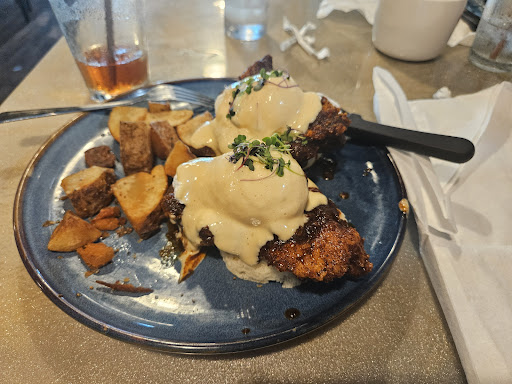 Read moreI expected a wait to get in. We came on a Sunday morning around 11:30 in July, but we were seated immediately. I ordered the Nashville hot chicken eggs Benedict. The server didn't hear me say the Nashville hot chicken part so they brought out the regular eggs Benedict. I told the food runner and they took it back to correct it. They seemingly cook everything fresh to order so it did take at least 10 minutes for my correct order to come out. I was so excited to try it but let me tell you.....if you can't handle spicy, then don't order this! I really tried to enjoy it. The seasoning was there. It had hints of sweetness mixed with savory but the spice hit me like a mack truck. After 3 bites, tears were flowing...from my eyes and nose 🤣! I thought the biscuit base with the eggs and sauce would help with the heat...I was wrong. It was so hot! Idk if they were heavy handed that day with the spice, accidentally dropped devil juice in or if this is their normal hey how ya doing let me boil your insides spice but man. Flavor was there but too hot for me, lol. Luckily someone at our table ordered a "normal" breakfast and could only eat half so I finished theirs since I was still hungry and couldn't eat mine. I didn't complain to the staff though. I ordered something that I wasn't sure if I'd like so that was on me. The service and atmosphere was nice with a man playing music. Overall it was a good sinus clearing experience and I'll return if I'm...