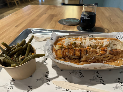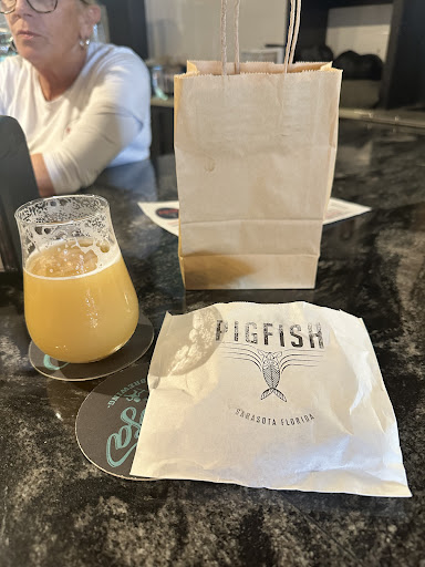 First of all, the passion of their chief chef led him on a quest to find what is likely the ONLY sustainable farm- raised Cobia source on the planet, in Panama! Seafood connoisseurs have long known this to be an incredibly delicious fish, as I learned decades ago when I was lucky enough to catch one on a deep sea fishing trip in Southport, NC. But In the past twenty years, I found it only twice on a menu, which explains why most people are unfamiliar with it. The quality and generous QUANTITY of perfectly seasoned, ultra-fresh filets served up in their âalmost to thick to biteâ sandwich with onion, tomato, lettuce, pickle, and bacon tartar sauce (but ask for a free side of their Jerk tartar if you dare!) on a potato roll will make you smile on first bite! It comes with your choice of sides (I went Caesar salad which was great). NEVER have I found such a ln amazing sandwich! Donât be put off because it is their priciest sandwich- realizing that itâs content was probably swimming somewhere in Panama that morning, was beautifully kept fresh and shipped by the Blue Cobia outfit, and it is legions above anything you have had. Besides that, you work hard and YOU DESERVE IT!! I chose to couple that with a Calusa Pirateâs Grog Berliner Weisse, light, 4%, and fruity that drinks like a fine French Chardonnay and was perfect with my sandwich! The chef is super cool and friendly, the entire staff upbeat and passionate, and deliver hot food promptly, and Kathy who took my order was terrific! Sorry I didnât get any deeper into the menu- I am confident they pour tha same passion into every dish, but, again, and you heard it here first, go big on your first visit with the Pigfish Signature...