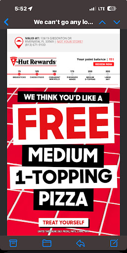 Read moreI've been going to Pizza Hut since I was about 4 years old my mom used to take us all the time. I'm 65 now. Ordered two pizzas last night three toppings 14-in never got a pizza anywhere from any place as bad as they were even Domino's was better last week.for one the toppings were very slim for a three topping pizza we had to look for the bacon cuz we couldn't even find it or taste it hardly. Pepperoni was even very light maybe two slices per every other slice. The sauce was unfindable. Any sauce that was on it was pushed up against the crust nothing on the flat part of the pie except the little color red. Couldn't even taste the sauce and that's the main ingredient that makes the pie. Onions are far and few between. The only thing that we can really see was on the pizza was pepperoni and mushroom. Even though the pepperoni was very slim you can't miss it or the mushrooms. We found ourselves searching for the bacon and the onions. from time my mom used to take us there till now I never got this lousy of a pizza from Pizza Hut that's why we ordered it was a good deal and the pizzas usually good. Usually I order extra sauce but I forgot. Even though I didn't order extra sauce we shouldn't have to look for it we picked up the cheese and couldn't see sauce hardly anywhere but a little reddish color on the dough and and the sauce we did see was pushed up against the crust not evenly distributed. I owned two restaurants and I made pizza and they were even better than these were and Pizza Hut is usually really good and I haven't been making pizzas for what 50 years like Pizza Hut and the ones I made in my...