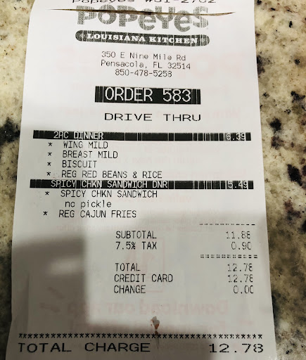 Read moreHorrible! Popeyes is possibly my favorite place to eat. But our local restaurant let me down. The one downside to all the Popeyes locations is difficulty ordering. The Huge downside to our local place was poor customer service! The lady taking my order had a hard time understanding me. That made me worry my order would be wrong. So when I got to the window I tried to confirm said order. The lady said it was correct. Sadly when I checked my food it was wrong. When I went inside to fix it the manager ( I assume. She was wearing a blue shirt and NO MASK!!Also most of the staff was maskless.) Had serious attitude and treated me like her child who she is really disappointed in and can't muster any energy or a smile for. With much annoyance she told me I paid for a meal I didn't get and still needed to pay for food I ordered but was not charged for. While I was waiting for them to fix my order, a gentleman wearing a mask got the same bad attitude and scolding "I can't hear you." From the manager I got. Hello!! We're wearing masks and talking to you through plexiglass! Listen better!! When I finally got home I realized in my frustration I had not gotten my son's food and had to share ours with him. The last straw? Spicy chicken for my children when I asked for mild and old, dry fries and shrimp :(. The Nine Mile location needs to try harder to make the customer happy and feel welcome. Instead of making us feel like we're...