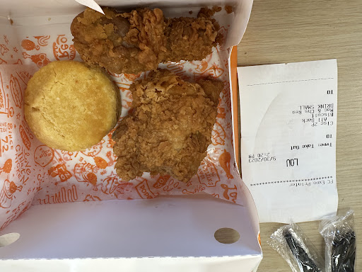 Read moreI’m a truck driver, so I came to this TA truckstop to get a 30 minute break. Decided to get some Popeyes chicken. I got the classic, which is definitely not spicy. I got the two piece combo, dark, with macaroni and cheese and a drink. It came with a biscuit. I took pictures, to indicate the size of the pieces of chicken. Definitely no growth hormones, and that. Tasted fresh, and hot. The biscuit was loaded with butter on top. Really actually too much butter , and the macaroni cheese is very good! The honey is a honey, it’s honey sauce, with high fructose, corn syrup, and sugar amongst other things, added to it. When I looked at my receipt, after I crumbled it up, I realized it was a 50 set up charge for my mac & cheese, and then they add a food, tax, and a drink packs on top of everything else. I still...