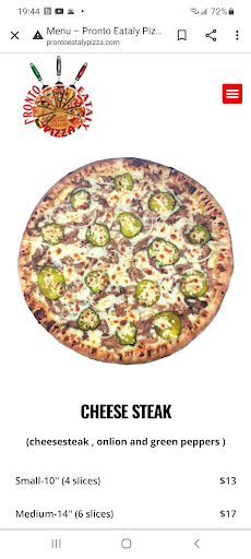 Get home and take a bite of the Cheese Steak Pizza only to find put it has mushrooms on it. Spit it right back out because I'm allergic to mushrooms. Re-checked the online menu to make sure it didn't have mushrooms on the ingredient list. Nope. Cheesesteak, onlion, and green peppers. (Not my mispelling of onion, theirs). Gave them a call back and was told, "Yeah that has mushrooms on it". Well your menu doesn't say that. They look online and see that we are correct. We are told they will remake the pie and it'll be done in 15 mins. Great! Since we live about 10 mins away, my wife left right away to get the new pie. About 5 mins into her trip her cell phone rings, and it's Pronto. The owner wants the original pie back. Weird and an inconvenience, but ok. She turns around and gets the other pie, minus the slice I bit and spit out.
