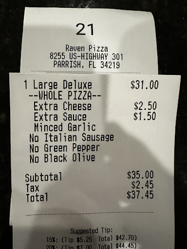 Read moreTerrible pizza experience! We ordered a large “Deluxe” pizza for delivery last night, which was quite small and cost $35 + tax and tip ($37.45 + tip = $45 for the smallest and lightest “large” pizza I've seen in, maybe ever, with next to no discernable toppings!). I really wanted Papa John's deluxe pizza for $22, which is loaded with fresh deluxe toppings; plus, I get multiple meals from their large, which is almost double the good at half the cost and loaded with fresh toppings. However, we try to keep our money in local businesses. When I ordered Pizza from Raven’s, I made the faulty assumption that, like Papa John's, I could substitute toppings and not be charged $1.50 for indiscernible extra sauce and that the “extra cheese” would count towards one of the toppings I had removed and not be charged $2.50! I was not made aware of these extra charges, nor would I have agreed to them. This review is only based on their pizza. The young lady taking the order was pleasant, and so was the delivery driver. However, $40 for a far smaller-than-average Deluxe pizza with hardly any toppings is not okay! I hope this helps support Raven’s...