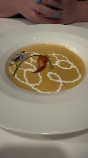 Here’s where we had some frustration. The menu descriptions do not capture the execution of the dishes lacking all the components to expect. The pork belly lists on the menu as GRILLED PORK BELLY creamy grits, blueberry reduction. What we got was a very busy plate which included overcooked pork belly pieces over grits with fresh blueberries covered with goat cheese, touch of green onions, the blueberry reduction down the edge, and a robust olive oil. The pork belly was not executed well and not the star. It was actually the olive oil that stole the show. The pork tasted like what you’d get in a pork fried rice. Completely missed the perfectly rendered fat aspect of what you’d expect from a pork belly appetizer. The lobster bisque was more like a porridge than a bisque. Very thick and not smooth. Flavor was on point just another disconnect from the menu. We ordered a new round of cocktails with an Evening Primrose and the Bunkhouse. The gin drink was well balanced and very nice. The bourbon drink was too sweet with the artificial flavor taking away from the bourbon. Why not muddle fresh peaches with freshly brewed tea with the fresh mint instead of using a syrup. This was actually taken off the check.
