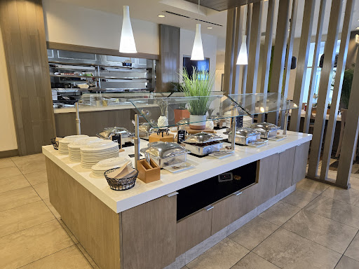 details: we interacted with several servers and the head chef during our stay. they were all friendly and helpful. when items were low on the breakfast buffet, they were relatively quick to refill. the only item on the breakfast buffet that are not on a typical Holiday Inn hot breakfast was the french toast bake. all of the other items -- bacon, scrambled eggs, turkey sausage, biscuits and sausage gravy, pastries, cereal, toast, etc. -- are commonly found but the chafing dishes were better than average. they did have a large dish of fresh fruit--grapes, melon cubes, fresh pineapple pieces, sliced strawberry. white and chocolate milk were available. chobani yogurt, too. the oatmeal was a bit on the watery/slimy side for me. they had brown sugar and other additions for the oatmeal. no pancakes or waffles for the buffet. they were on the menu option. i'd recommend reviewing the breakfast menu and looking at the breakfast buffet before making your choice. all that i had on the lunch/dinner menu was good, but overpriced. sandwiches from $15-19 apps from $12-18 salads, $12-19 pizza, $14-16 other entrees, $14-34