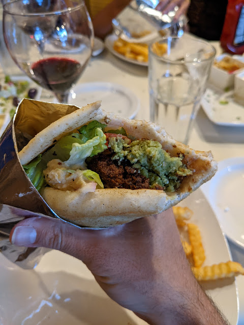 We ordered a platter of pita, gyro meat, and spreads, including a babaganoush and hummus (both delicious, the latter of which my wife thinks much tastier than commercial varieties), and a falafel wrap. I mentioned that I like falafel, and I've eaten some pretty tasty, as well as some pretty mediocre ones. I found these falafel to be crunchy on the outside, tender and moist on the inside, vivid green with the included herbs. The fries on the side were also surprisingly very fresh and worth eating, and this coming from someone that doesn't like fries that much.