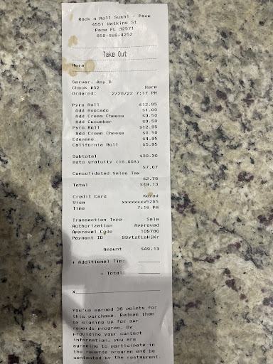 So we were just charged an automatic 18% gratuity on a take-out!!!! We wonât be doing business here again. Canât imagine what dine-in gratuity is. When my husband asked he was told it was automatic due to COVID! They pushed for a payment over the phone and didnât disclose the total until I asked after she took the paymentâŚnow I know why. My husband said they also didnât even ask for his signature and tried not to give receipt. He had to request a receipt after the server handed him his food. When I called and spoke to the owner, Kody, he told me it was a charge due to COVID and for take-out costs for paper products, I said so itâs not for gratuity and he said yeah it is, and I said but you pay paper goods out of it? I said thatâs unethical to disclose it as gratuity if youâre using it to pay for other things and he said it is gratuity and he shouldnât have to explain how he pays his staff to me. Very shady business practices. He offered to reimburse me the $7 but I declined since I would have to drive all the back for $7. Itâs not about $7, itâs the principle of charging a fee, which used to be based on service and performance driven, and also not disclosing a fee called gratuity, and why was paper product costs mentioned? Also I was taxed after the added 18% gratuity. The server told me âyou donât think our chefs deserve it?!â Wow, just wow! 18%!!! Rock and Roll Sushi has lost our business! đĄ Also, I gave 1 star bc no stars wasnât an option. When I told the owner this was bad business and poor customer service, he said he owned 3 stores, GB, Beulah and Pace and all of his businesses were doing just fine. I would assume so charging an 18% fee on all to-go orders and paying staff and to-go costs by charging the customers extra. Great...