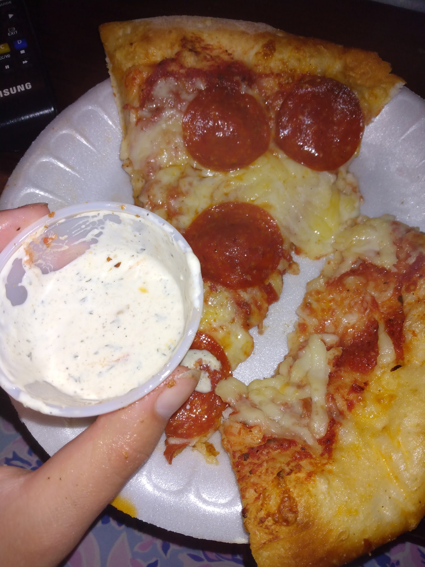 Read more5 for service and quantity, decided at the last minute to have a Halloween pizza party. Ordered delivery, one large pepperoni and one large chicken, the pepperoni was eaten right away so there is no pictures, both pizzas were loaded. I do have a picture of whats left of the chicken. This pizza was so good and smelled so good, the yard suddenly filled with cats. Me and 3 other neighbors ordered pizza and a 2 litter cola and sat around telling ghost stories all while protecting this tasty pizza from the cat invaders who seemed to be working in teams. When seeing how low the price was, I figured there would be less than a handful of toppings, OMGoodness, wait till you see the picture of how much they put on this thing. The delivery person was cheerful and very pleasant. I don't remember what the wait was but it was worth it. Couldn't have been much more than 30 minutes. This just might become my new Halloween tradition, if you can imagine talking about ghost, in a dim lit yard with cats circling around you like a pool full of hungry sharks. Every shadow you look at has the reflection of eyes and more are coming from all over the neighborhood. They sit and they stare till finely one has inched its way close to the pizza, it is just with in reach and at the same moment someone reaches for another piece not noticing the cat just at the edge of the box. The cat realizes its cover is blown and darts to the other side of the yard, all are startled but the activity cause by the amazing fresh smell of this pizza has stirred up other life forms. Suddenly a guest sees one of the treat bags move. We get up to investigate, a small frog has jumped into the bag. We chase it out and I started talking to it, it responded as if it understood me. I am not creeped out, not yet anyway. I think it is so cute , I keep talking to it. It looks me right in the eyes, then jumps on my arm. In my best scared little girl voice, I demanded someone get it off. OMG, OMG, OMG, it peed on me. Now I am grabbing my phone to check and see if its one of those frogs that have poison on its skin. Nope, just a harmless tree frog that thought I was a friend. Best Halloween party ever and all because the pizza smelled awesome. I mean, really, you couldn't plan a...