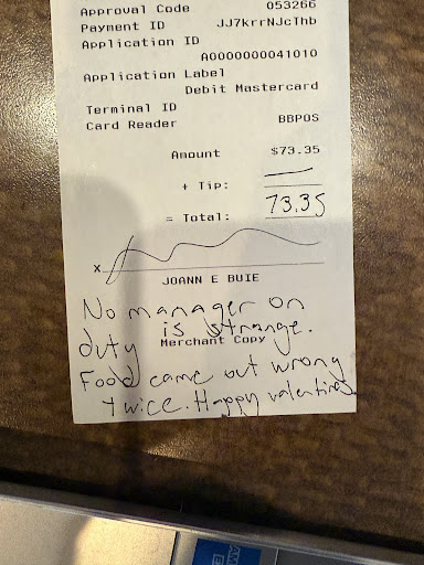 My family and I have been coming to the westchase location since it opened and it’s sadly gone downhill. Service hasn’t been great the past few times we have been in, but we love the food enough to give it another shot on Valentine’s Day. We arrived at 2 pm and there were only a few other guests dining. David took our order without writing it down, our appetizer came out 1 minute before the entrees and David decided to disappear after that without giving us a heads up. Our fiesta quesadilla came out wrong bc he chose not to write it down and no one came back to check on us after food was brought out. Madeleinne took over apparently without letting us know. We asked 2 people to send our server over because no one checked on us, we wanted to make a Togo order as well. Madeleinne left our drinks empty and table cluttered while we waited for our delayed Togo order. She also said Davids shift was over. My grandmothers fiesta quesadilla came out wrong AGAIN missing rice and beans???? When we asked to speak to the manager, we were told they would be in later for dinner???? My grandma called hourly that night and no manager called her back. She finally received a call back today, February 17. The “manager” said he runs 3 locations and offered her a free appetizer over the phone. Even though it was the fiesta quesadilla that came out wrong. Expected more on Valentine’s Day when it wasn’t busy. I’m sure when we go to use the free appetizer it won’t actually be valid bc it was verbally told...