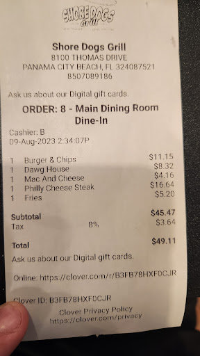 Read moreMe and my friend like to try new places to eat, she is pregnant so her cravings vary. Tonight we wanted to try Shore Dogs and I must say I am very disappointed. I ordered the fried pickles as an appetizer, we they came to the table they looked very flimsy, and were not crunchy at all. The taste was not appealing either, I sent them back and changed to a different appetizer. I ordered the Gyro with lamb meat and French fries as my meal. I took maybe 3 bites of my gyro and couldn't eat anymore, it was bad, I've eaten plenty of gyros and this was the worst. The pita bread was stale and falling apart in places and the meat had a very weird taste. At the end of our meal when the waitress came over I explained to her about the gyro and how I couldn't eat it and was told that since I had taken a bite of it the best she could do was take some money off my bill, when I received my bill she had charged me $1.52 more for the gyro, and $1.00 more for my appetizer that I did get. When I brought that to her attention she informed me that when she rings the item in it automatically charges tax before hitting the total button...I ended up paying $32 for a gyro I didn't eat, French fries, and an appetizers that I did get, and oh I was also charged for the sauce that automatically came with the appetizer. I will not be dining here again, and my advice to anyone who reads this pay attention to...