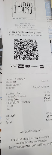 My Husband and I went here on a Sunday. We didn't care for our breakfast at all. I don't know if we went on a busy day or whatever, but that should not matter. Good food and service should always be consistent. Okay, so we get there, the place is busy but we got seated right away. Our server came over and we knew what we wanted so we ordered right away. We waited more than 30 minutes for our food. Meanwhile a couple sitting adjacent to us were seating after we were, yet they were served before we were. I asked our server what was taking so long, she said "Your food is at the window, but I have this large table to take care of, then you will be up." I noticed the people at the table behind us were waiting a while and they were complaining and seemed upset. We finally got our breakfast and it was nothing to write home about. First let me say, the presentation was lacking. The portions were so small. I think I had only about 10 small pieces of potato on my plate. I ordered scrambled eggs with swiss cheese, home fries, corned beef hash and a side of short stacks. The pancakes were not cooked very well and tasted like instant pancake mix. Nothing special. The corned beef hash was very oily and greasy. Gross! My Husband ordered a bagel sandwich with egg, ham & cheese and home fries. Again, a small amount of potatoes. Also, he asked for a "toasted" bagel. The bagel sandwich was NOT toasted. One disappointment after another! Our waiter did not even ask us how the food was because she knew we were not happy! She put our receipt on the table and said "nothing" and walked away. And of course she did not get a tip. A tip should be "earned". I complained to the Manager and she wanted to give us a coupon and I said "We won't be back". Personally, I think there are plenty of other great breakfast places around Wellington than Short Stacks! Another thing, a "good" restaurant serves the food immediately -- not let it "sit" in the window,...